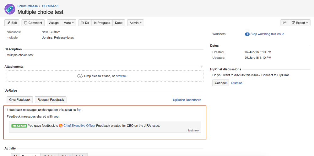 Continuous feedback is a feature module in Employee SuccessUpRaise, that lets Jira users give or request feedback against a Jira issue or independent of one. When tied with a Jira issue this feedback is also available within the issue details page. Refer to the screenshots below.